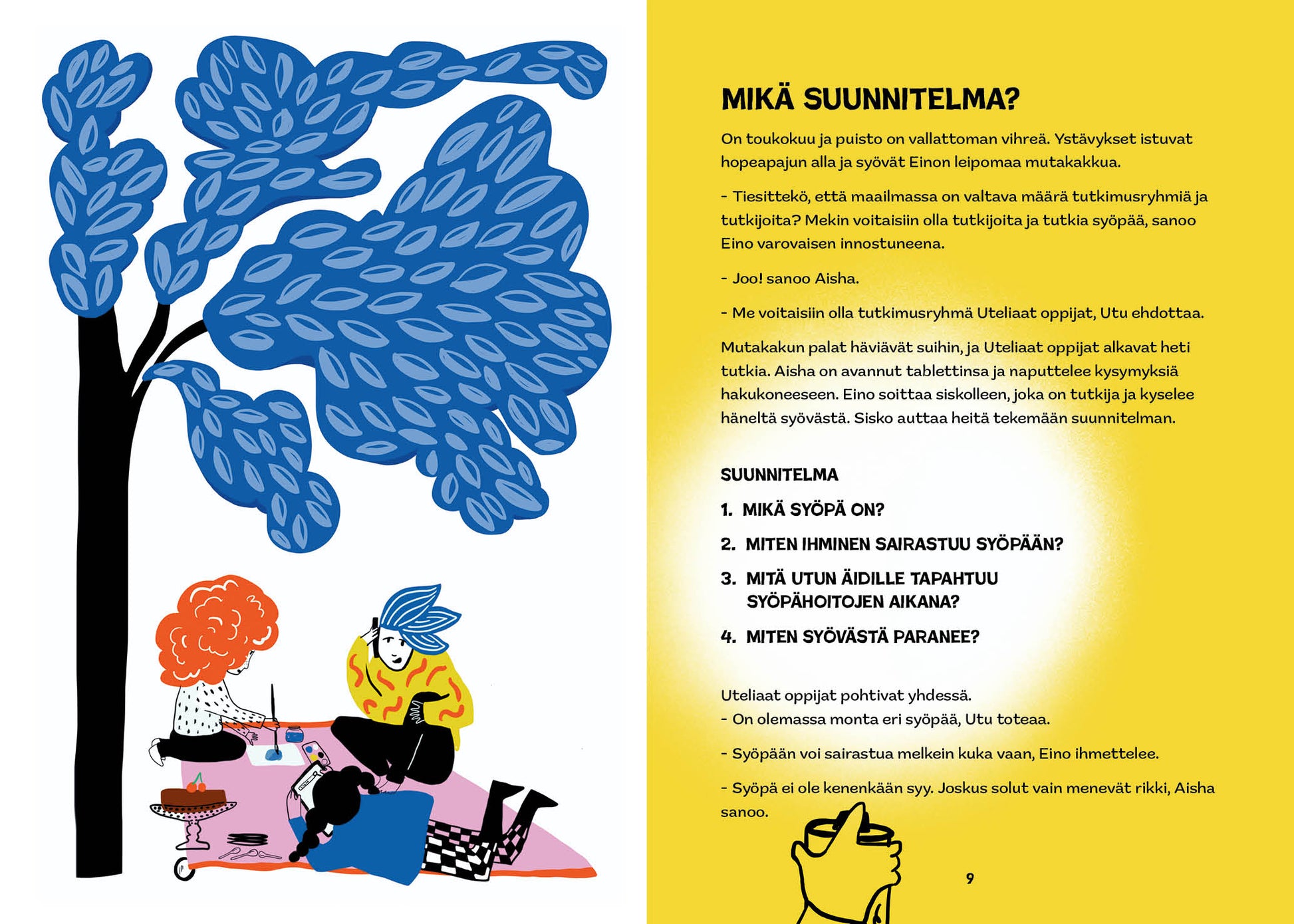 This is where the friends' big information search operation begins and the trio name their group Curious Learners. In the story, the children have adventures as researchers and learn about cancer and its treatment, and finally Utu's mother, who is undergoing treatment, recovers.