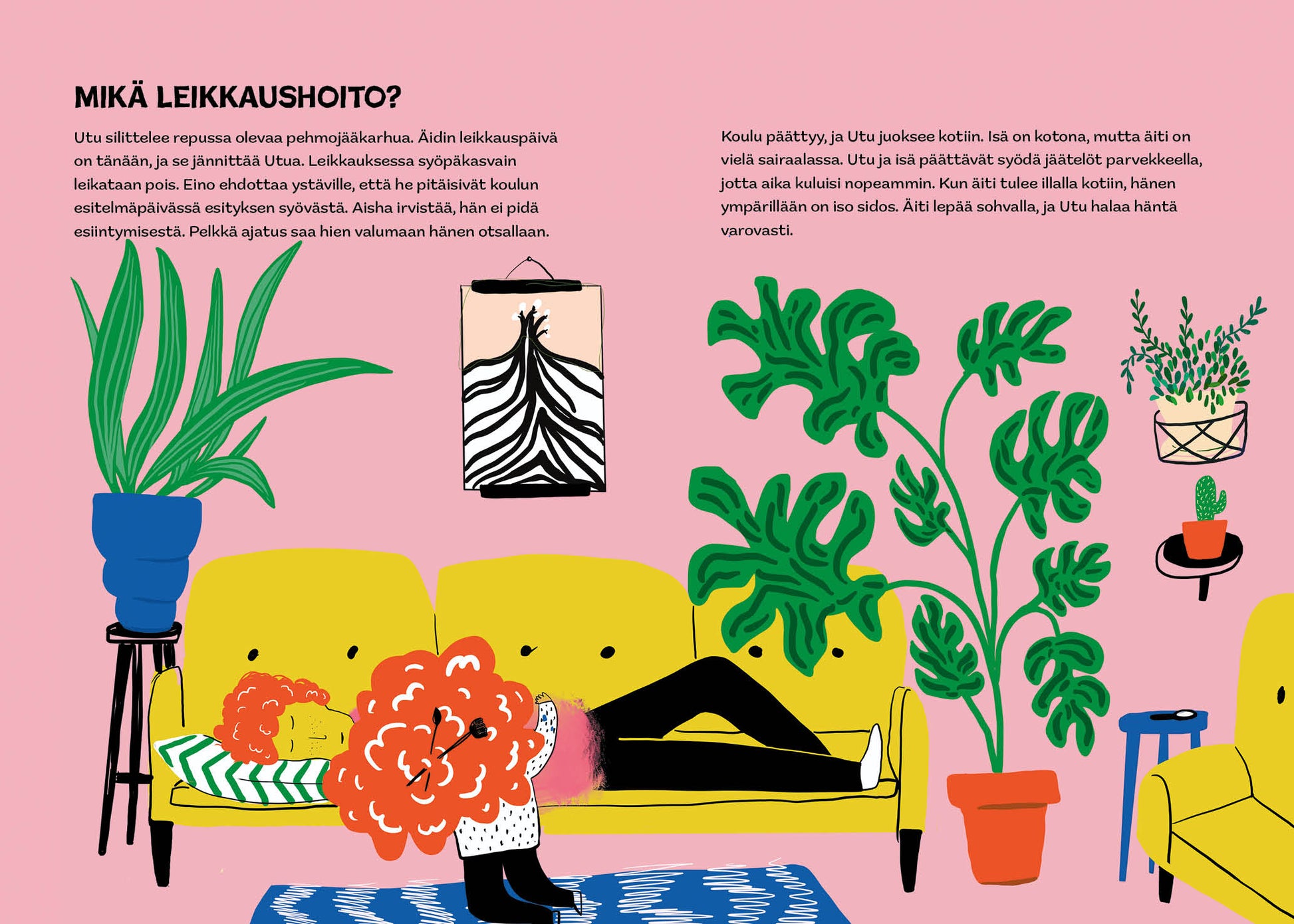 The children's picture book tells through a heartfelt story about three friends Utu, Eino and Aisha. One day, Utu's mother is diagnosed with breast cancer. This information raises many questions in the children. What is cancer? How does a person get cancer? What happens to Utu's mother during cancer treatments?