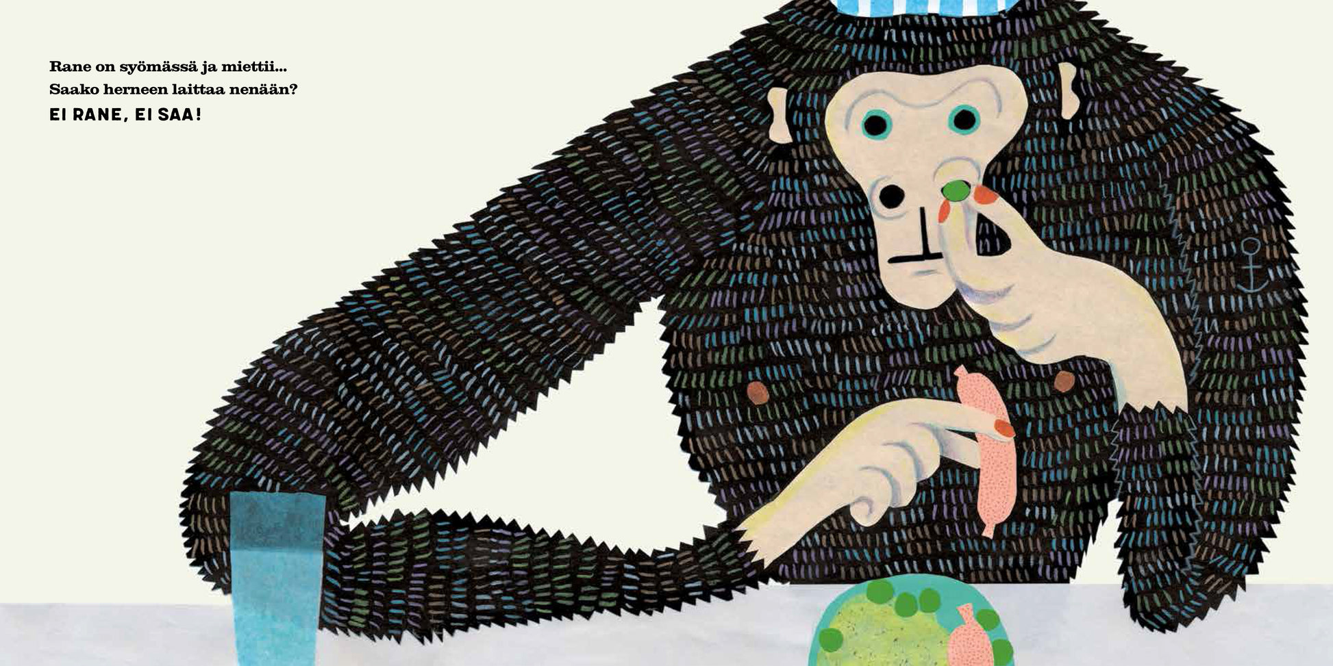 "Ruokailuun liittyvät tilanteet ovat lapsiperheiden arjessa usein hyvin tunnepitoisia. Siksi monet ruokailusta kertovat lastenkirjat sopivat hyvin myös tunnetaitojen harjoitteluun. [...] Uhmaikäinen Rane-gorilla ei ehkä aikuisen mielestä ole paras ruokatapojen opettaja, mutta lapsella on sen kanssa taatusti hauskaa... Hannamari Ruohosen pitkäraajainen, ilmeikäs ja ketterä Rane on hahmona veikeä uusi kuvakirjatuttavuus."