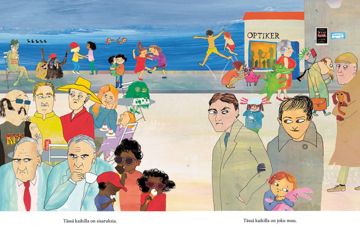 Kirjan kirjoittajan Mimi Åkessonin tiiviin tekstin on suomentanut Katri Tapola. Kuvittaja Linda Bondestamin tyylittelemistä hahmoista muodostuu hulvaton kokoelma meistä ihmisistä. Etsi kirjan sivuilta toistuvat hahmot, pohdi mikä on sinun oma tarinasi ja mieti, mihin eri joukkoihin kuulut ja mihin ehkä kaipaat. Ja mitkä ovat niitä, joihin et missään nimessä halua kuulua! Tämän suurikokoisen ja värikkään kirjan ympärille voi koontua koko perhe, ja sen ääreen voi palata yhdessä yhä uudestaan.