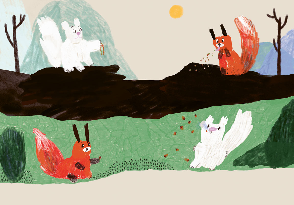 Huiskis on liito-orava, Tiksu tavallinen orava. Liito-oravat valvovat öisin, oravat päivisin. Normaalisti he eivät juuri kohtaisi toisiaan, mutta eräänä keväisenä aamuna linnut laulavat niin kovaäänisesti, ettei Huiskis saa unta. Hän lähtee pesästä ja kiipeää puun latvaan kuuntelemaan konserttia ja napostelemaan norkkoja. Hän näkee alhaalla maassa liikkuvan, ruskean pisteen ja liitää alas tutkimaan asiaa. Maahan laskeutuessaan hän säikäyttää Tiksun, joka on aloittanut päivän työt kaivamalla talvivarastojaan esiin. Pelästymisen ja ujostelevan hetken jälkeen Huiskis tarjoaa Tiksulle norkon, jonka otti mukaansa latvasta.