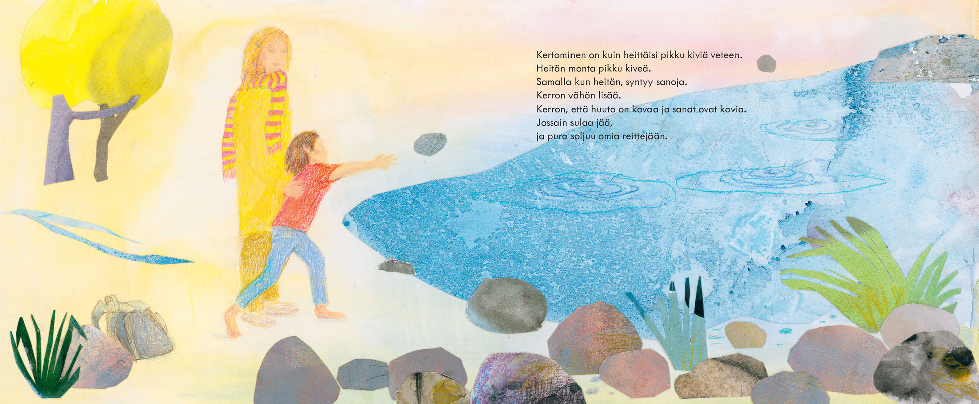 tilasta, paikasta tai vaikka valosta. Kiven ja veden kirja on Selja Raudaksen neljäs kuvittama kuvakirja.