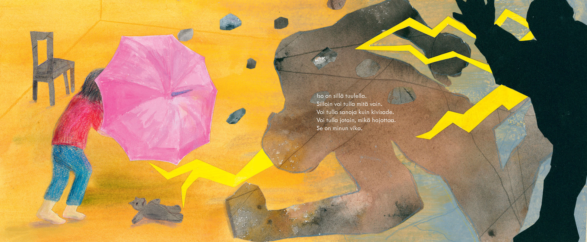 isoja asioita muodossa, joka on sekä lapselle että lapsen kanssa kirjaa tutkivalle aikuiselle helposti lähestyttävä. Se mahdollistaa tasa-arvon ja asioiden käsittelyn turvallisessa ympäristössä eikä tunne ikämääreitä. Kirja on peili, jonka avulla nimetä tunteita ja ilmiöitä ja joka kantaa mukanaan lupauksen toivosta ja muutoksen mahdollisuudesta. Kirjaan tulee turvataitokasvatusta tukeva sanataidetehtäväsekä yhteydenottotiedot tuen tarpeessa oleville lapsille ja heidän kanssaan työskenteleville aikuisille.