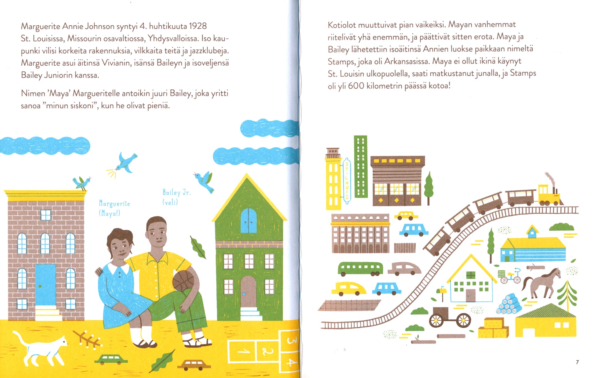 Pieni opas suureen elämään – Maya Angelou vie lukijan Mayan ihmeelliselle matkalle isoäidin sekatavarapuodista aina presidentti Clintonin virkaanastujaisiin Noa Snirin oivaltavan kuvituksen ja Danielle Jawandon helppolukuisen tekstin avulla.