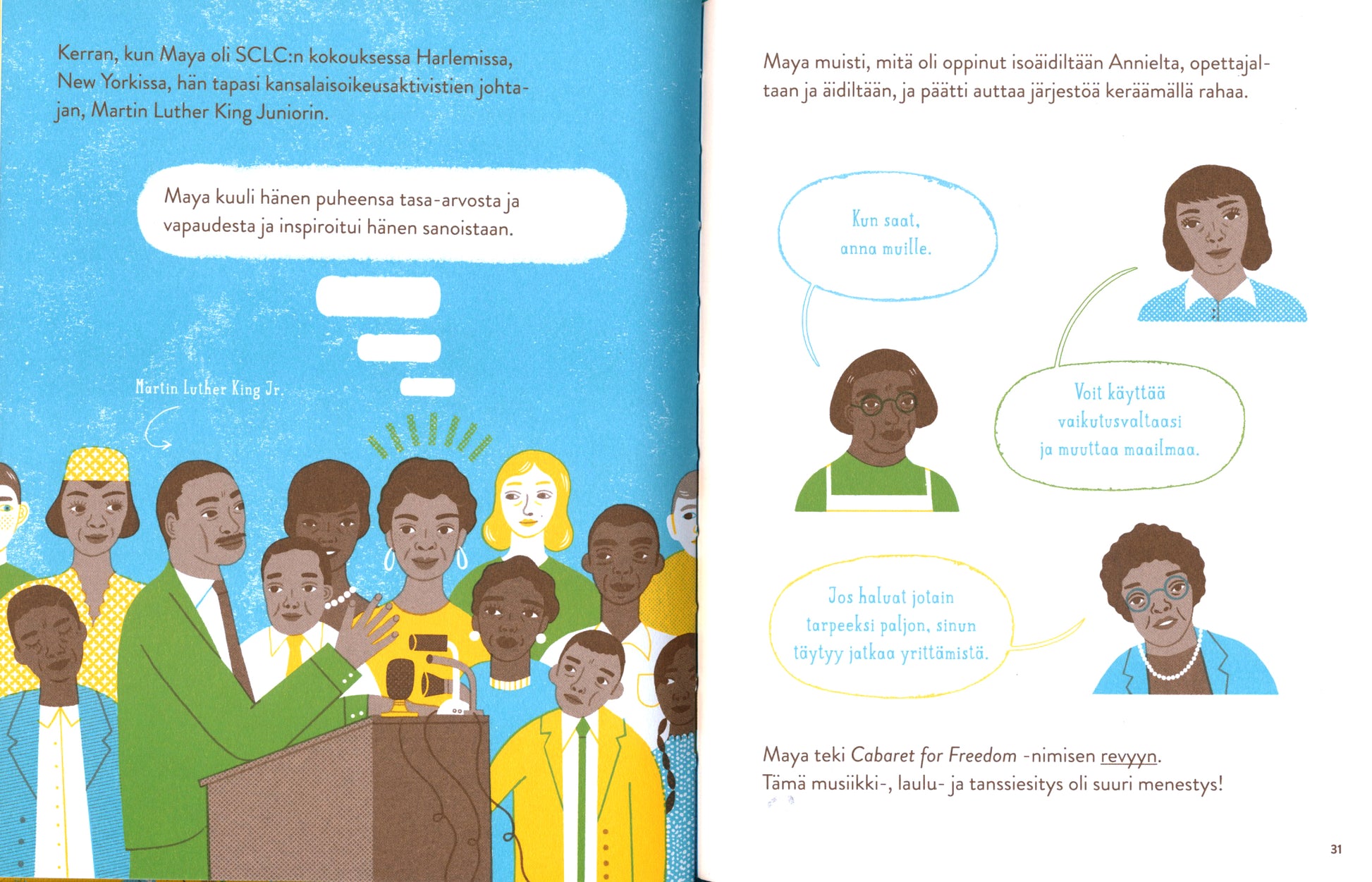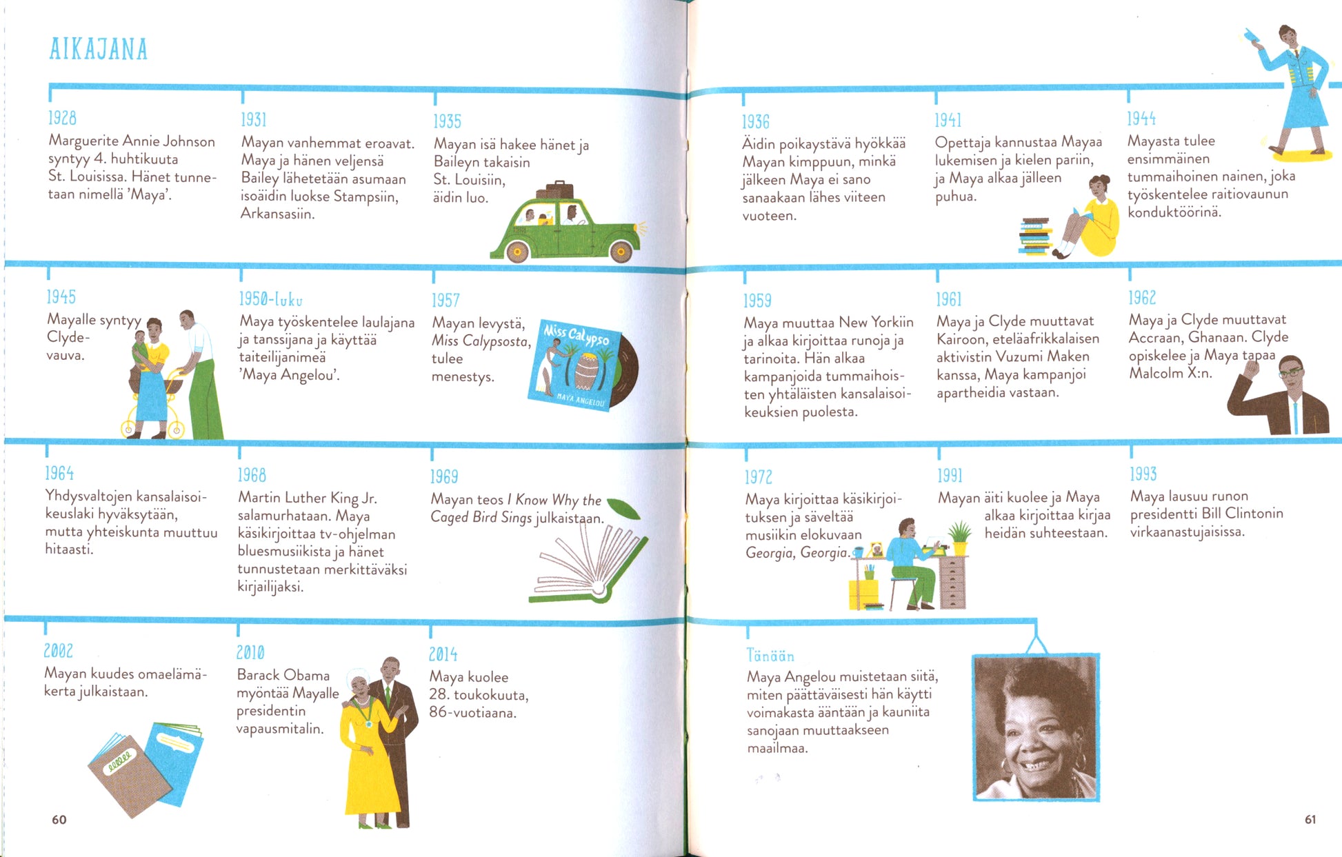 Maya Angelou oli afroamerikkalainen kirjailija, laulaja, tanssija, opettaja ja kansalaisoikeusaktivisti. Hän kampanjoi tummaihoisten tasavertaisten oikeuksien puolesta Yhdysvalloissa ja Etelä-Afrikassa. Mayan mottona oli: ”Älä koskaan hyväksy vastaukseksi sanaa ei”, ja hän käytti taidettaan välineenä kamppaillessaan ennakkoluuloja ja vaikeuksia vastaan. Mayan elämä ja taide innoittivat jo hänen aikalaisiaan, ja ne inspiroivat meitä yhä rohkeudellaan.