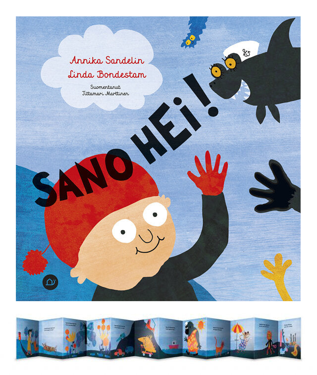Sano hei! on vuorovaikutteinen, haitarikirjan muotoinen seikkailu aivan pienimmille lukijoille. Riimit ja lorut on kirjoittanut Annika Sandelin ja suomentanut Tittamari Marttinen. Linda Bondestamin railakas kuvitus täydentää tarinan hullunkuriseksi kokonaisuudeksi.
