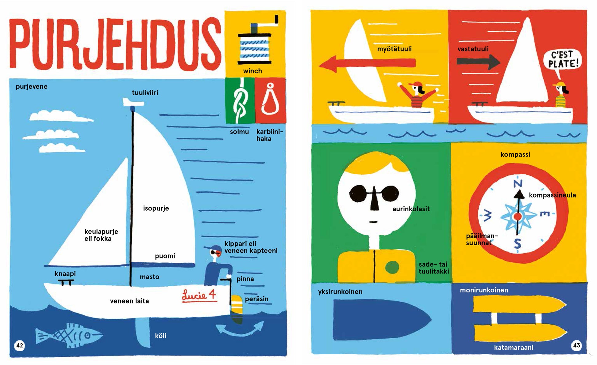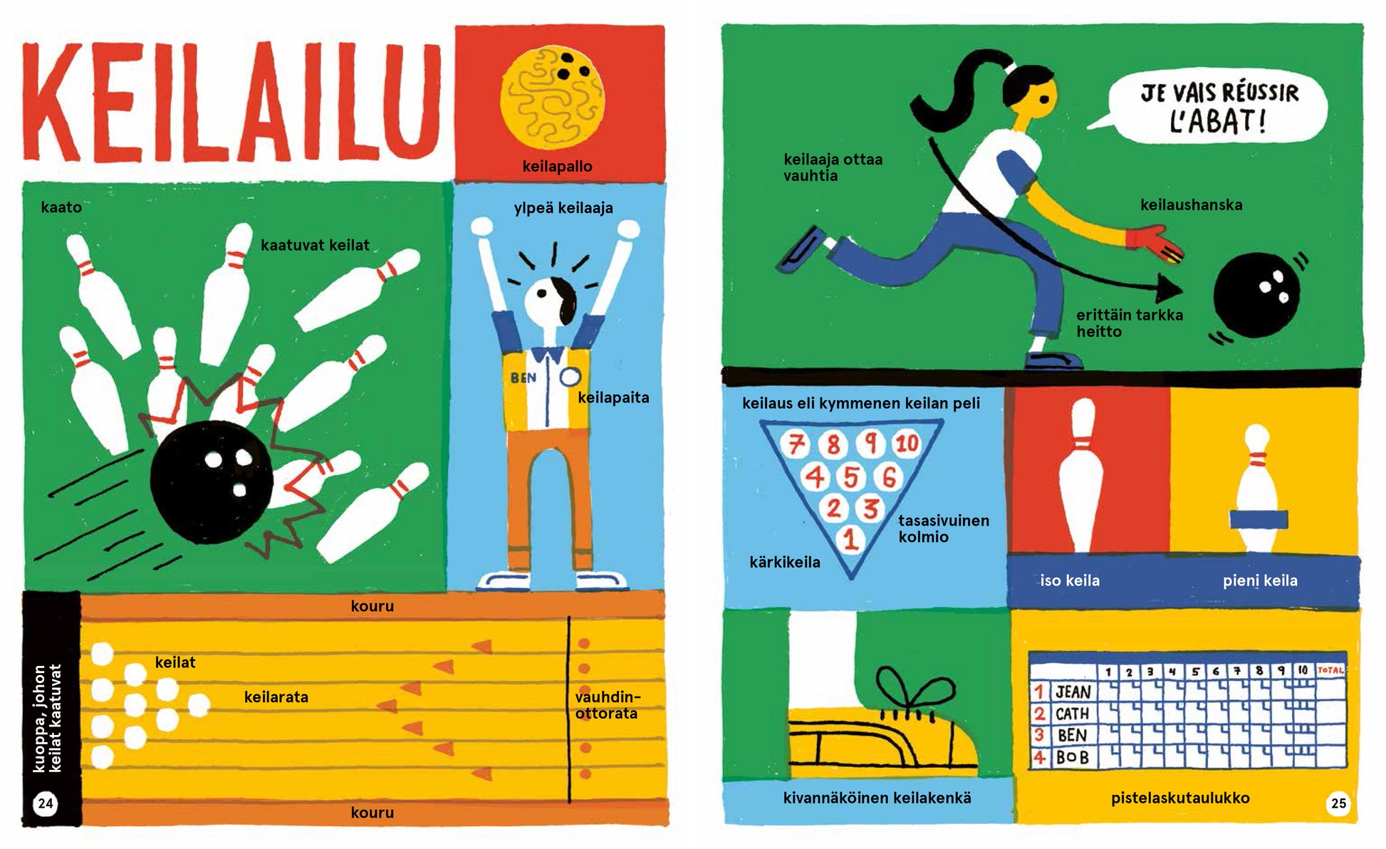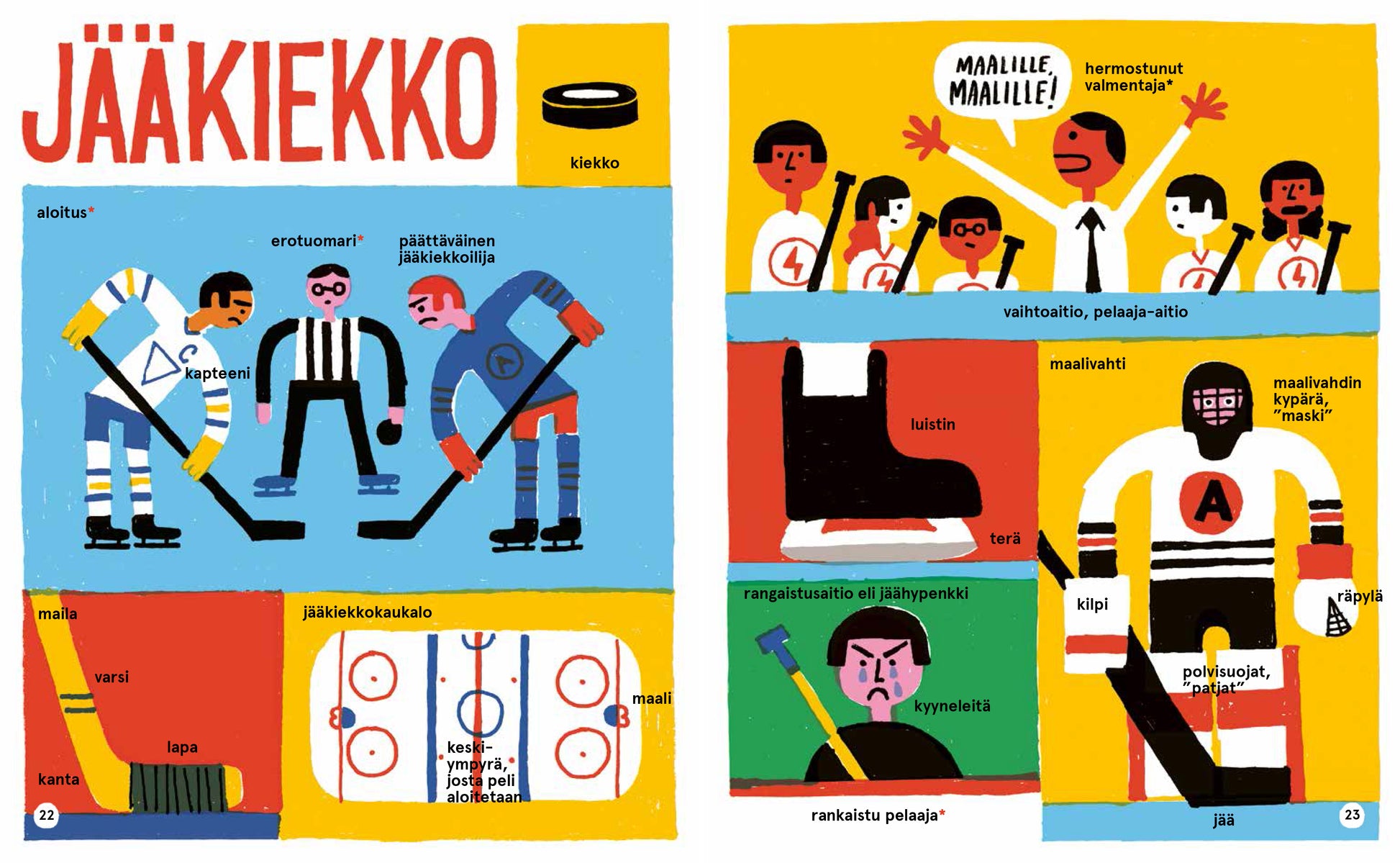 Lukijat voivat perehtyä lajien sanastoon, sääntöihin, välineisiin ja millaisia varusteita ja vaatteita urheilijat käyttävät. Kirkkailla pääväreillä toteutetut kuvat opastavat kunkin lajin perusteisiin, ja humoristiset sivuhuomautukset tekevät lukemisesta hauskaa. Keskiaukeama on nimeltään puoliaika, ja siinä lukijaa pyydetään etsimään ja laskemaan urheiluun liittyviä esineitä. Kirjan lopussa oleva sanasto tukee liikunnan opetusta myös päiväkodeissa ja esiopetuksessa.